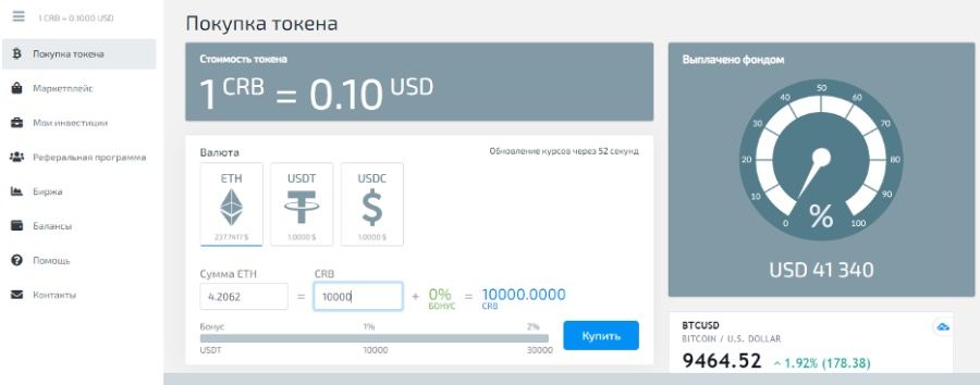 Kies daarna in u CRB-rekening "Koop 'n token", voer die hoeveelheid tokens in (byvoorbeeld 10.000 CRB-tokens, die koers van 10 CRB-tokens is $ 1), klik op die aankoop en 'n venster verskyn met die adres van die beursie waarheen u cryptocurrency stuur. Die gemak is dat u kan kopieër en u kan die kode net vanaf u telefoon skandeer met die MyEtherWallet-toepassing (MEW Wallet).